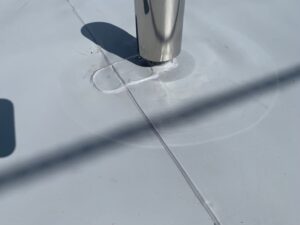 現地を確認したところ、既存のアスファルト防水層の劣化が進んでおり、特にフェンスの支柱部分からの漏水が確認されました。