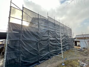 足場を組んで、塗装工程に移ります。